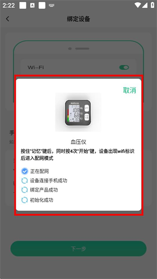 4、按照提示操作血压仪,完成配网、连接手机等步骤以完成设备绑定。