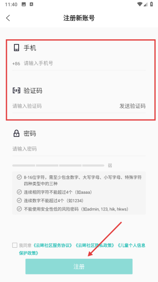 4、在注册新账号页面,输入手机号、验证码、密码后点击注册按钮,完成账号注册操作。