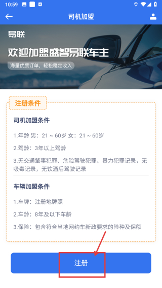 2、在司机加盟页面,点击注册按钮,进入加盟方式页面。