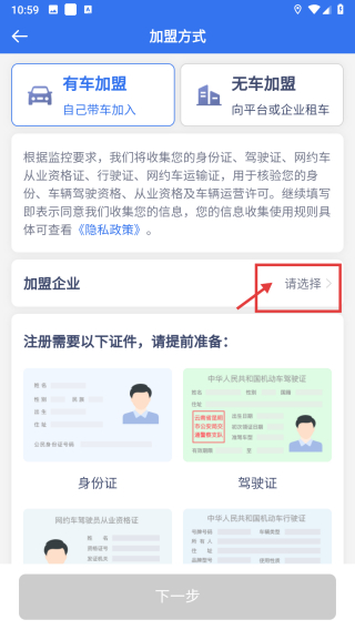 3、在加盟方式页面,点击加盟企业的请选择选项,进入选择加盟企业页面。
