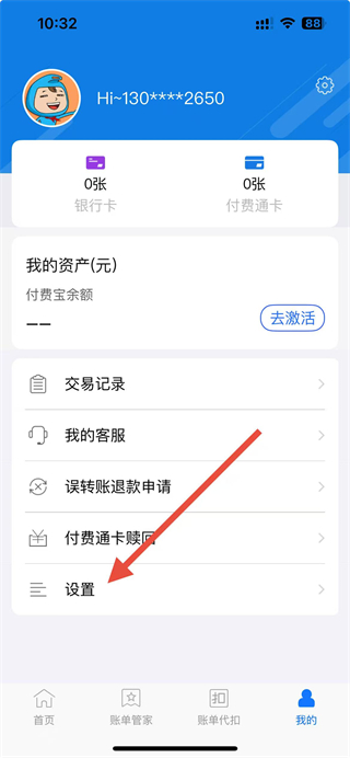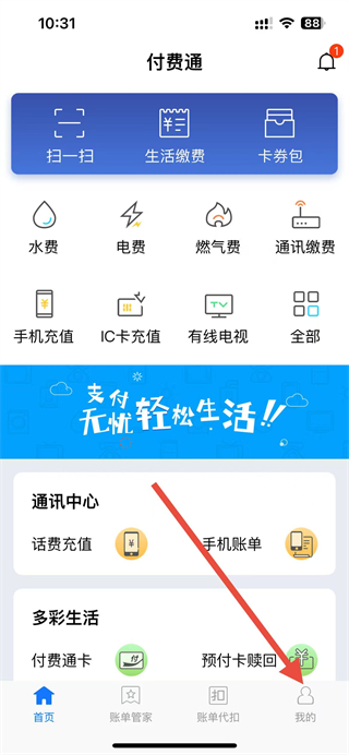 1、打开付费通app,点击右下角我的选项,进入个人页面。
