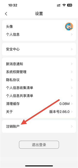 3、在设置页面,点击注销账户选项,进入付费通账户注销须知页面。