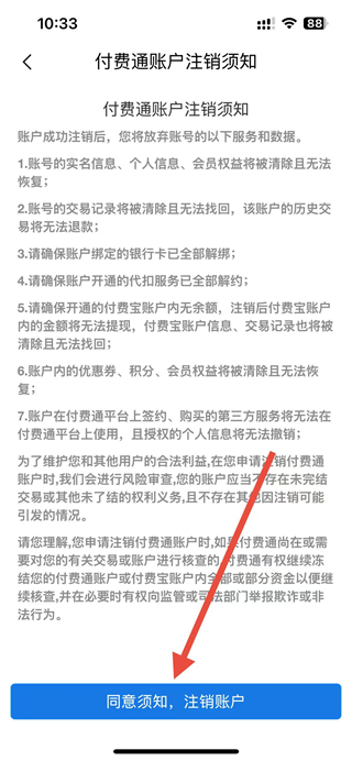 4、在付费通账户注销须知页面,点击同意注销账户按钮,按照提示完成账号注销操作。