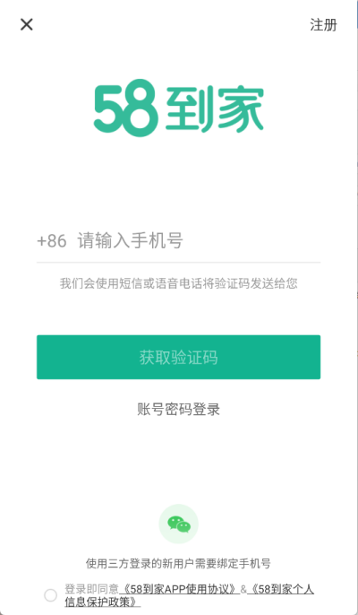 1、首先打开下载好的58到家APP,进入软件后在登录界面可以输入自己的手机号进行登录,输入手机号后点击获取验证码选项即可;