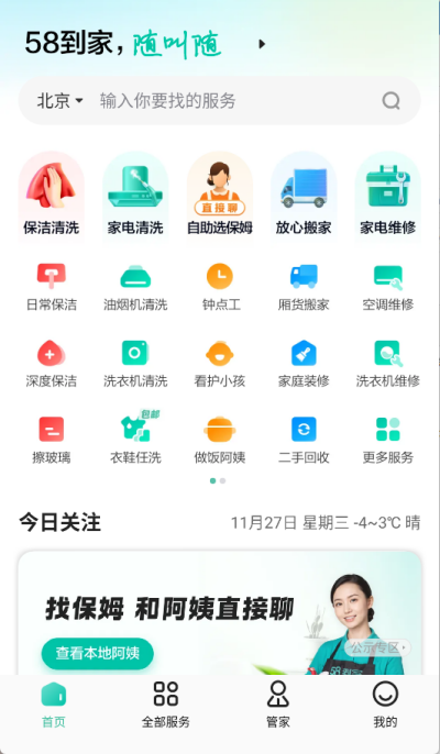 58到家精选app是58同城自营的国民级生活服务平台,覆盖全国128个城市,为用户提供近300类一站式家庭服务,核心涵盖保洁清洗、保姆月嫂、家电维修、搬家速运、洗衣洗鞋等刚需品类,细分日常保洁、日式收纳、CMA甲醛检测等精准服务,满足生活多元需求。