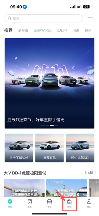 1、打开汽车服务类APP,点击底部商城选项,进入商城页面。