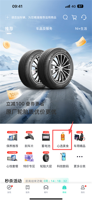 2、在商城页面,点击心选美食分类标签,进入心选美食商品列表页面。