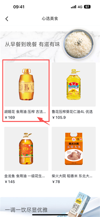 3、在心选美食商品列表页面,选择胡姬花食用油压榨古法花生油6.18L 优选商品,进入商品详情页面。