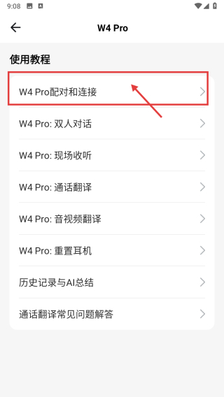 4、在W4 Pro使用教程页面,点击W4-Pro配对和连接选项,查看该产品的配对连接教程。