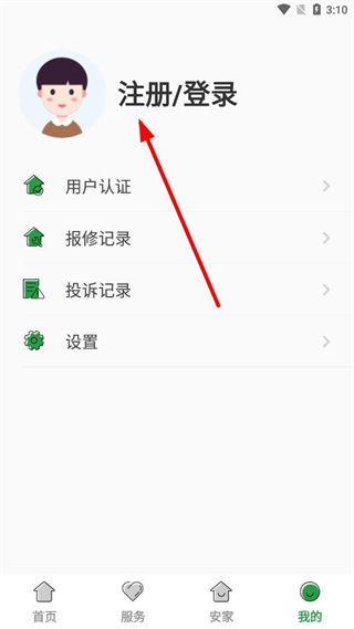 2、在个人页面,点击注册登录选项,进入登录页面。