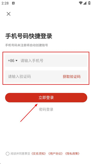 3、在手机号码快捷登录界面输入信息,勾选协议后点击立即登录完成登录。