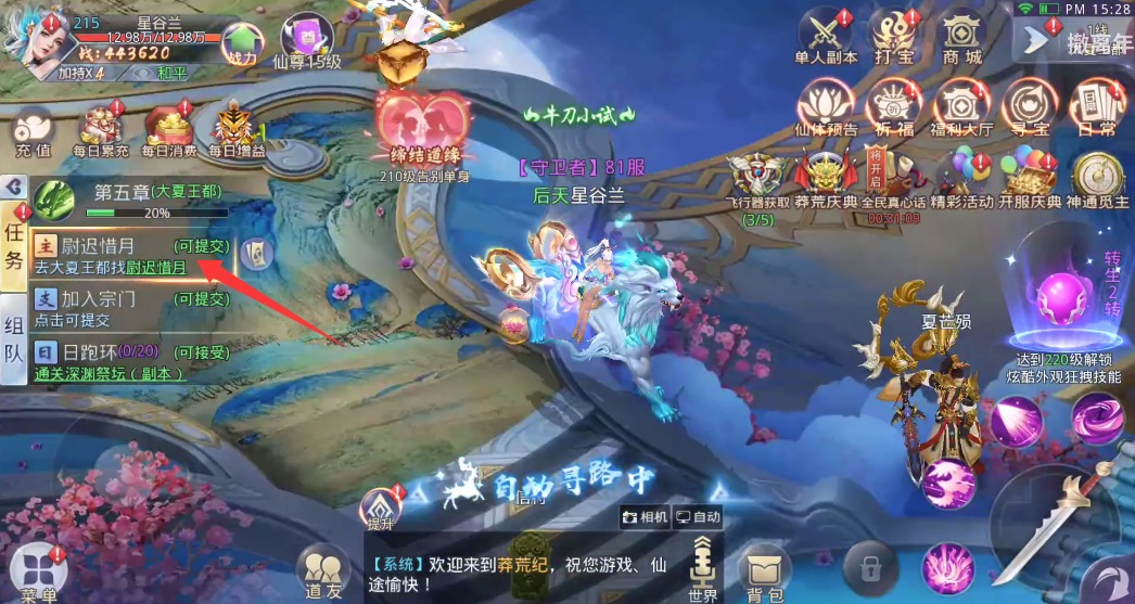 1、初次进入游戏后点击左侧任务栏接取任务,系统将自动追踪并引导任务路线。
