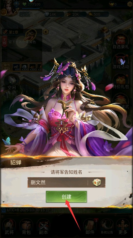 1、首先输入角色专属名称完成创建,正式开启这段三国策略争霸的完整征程。