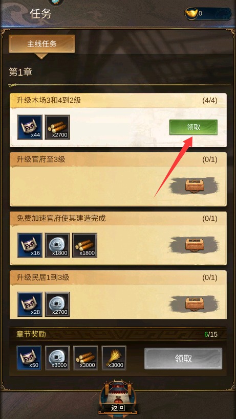 4、达成任务目标后及时点击领取奖励,收获资源与道具助力势力持续发展。
