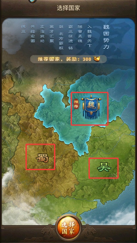 2、从魏、蜀、吴三大阵营中选择效忠国家,这将决定你的初始势力与发展路线。
