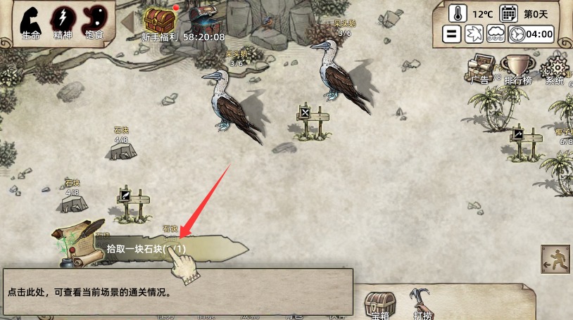 4、在沙滩区域仔细寻找石块并点击拾取操作,完成初始任务掌握生存基础技能。