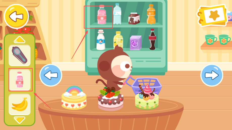 1、进入游戏选择购物清单,根据提示认识不同商品类别和摆放位置,开始购物体验,学习商品分类和超市布局的基本知识。