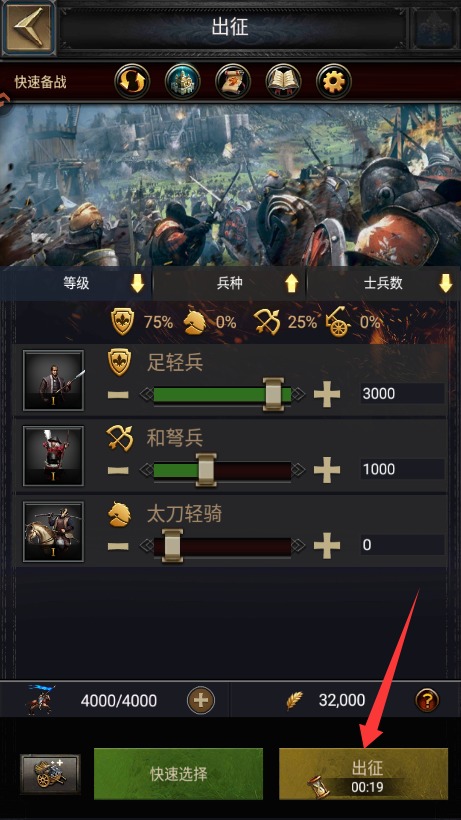 4、使用快速选择功能确定出征部队配置方案,点击出征发起攻城战役军事行动。