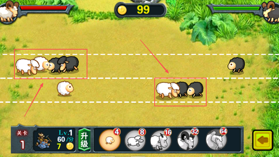 2、拖动白山羊到防御位置,通过合理布阵阻挡黑山羊前进,根据不同类型的黑山羊特点调整防御阵型,运用策略思维解决问题。