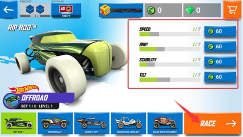 3、点击升级按钮使用游戏金币强化车辆性能,可提升引擎马力或改善轮胎抓地力等属性。