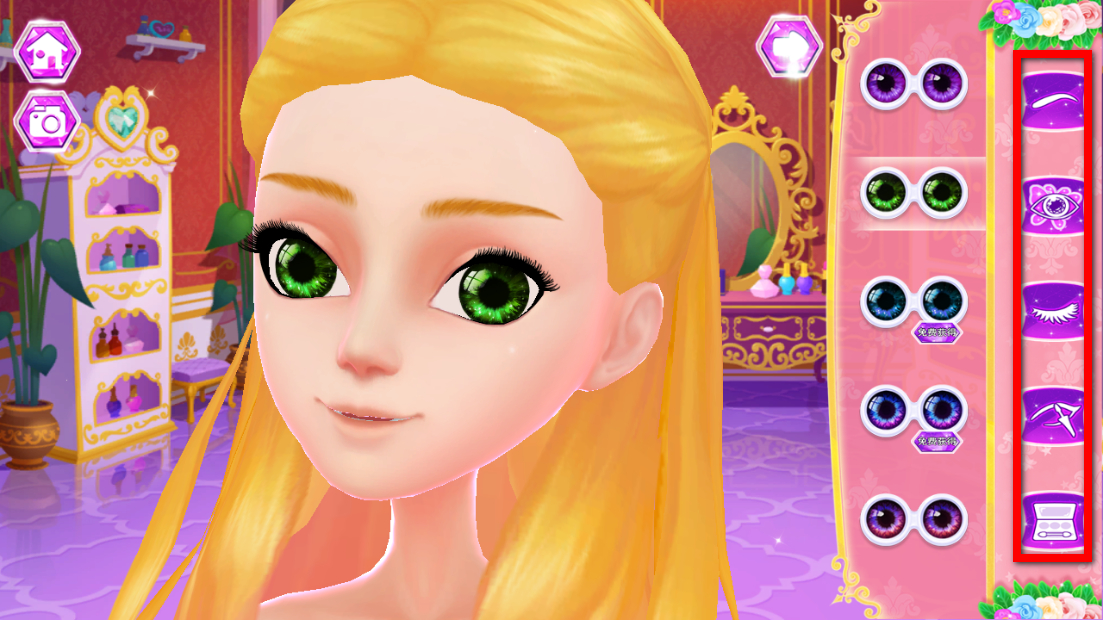 2、在化妆界面,选择右侧不同类别如眼睛、眉毛等,为角色打造妆容。
