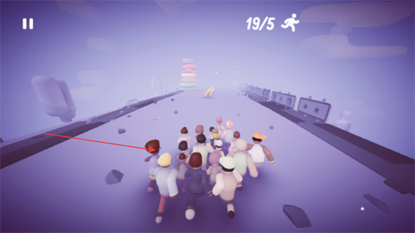 1、操控人群在赛道上奔跑,不断收集沿途的人员,壮大队伍规模如从5人发展到19人。
