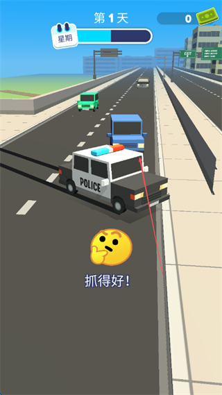 1、驾驶警车在道路上抓捕违规车辆,成功抓捕后会显示抓得好!。