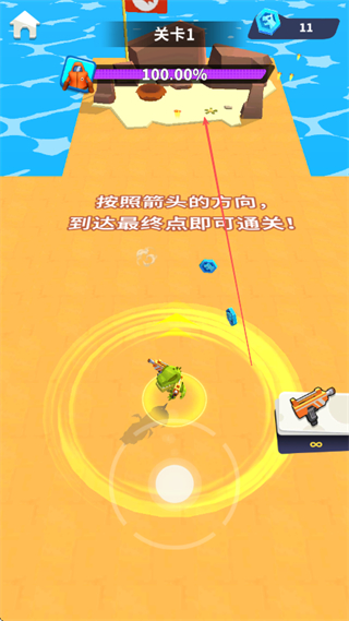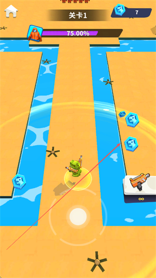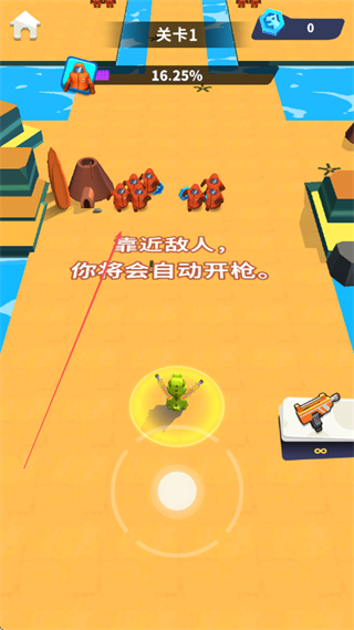 2、持续靠近敌人,自动射击消灭它们,同时收集蓝色宝石,提升关卡完成度。