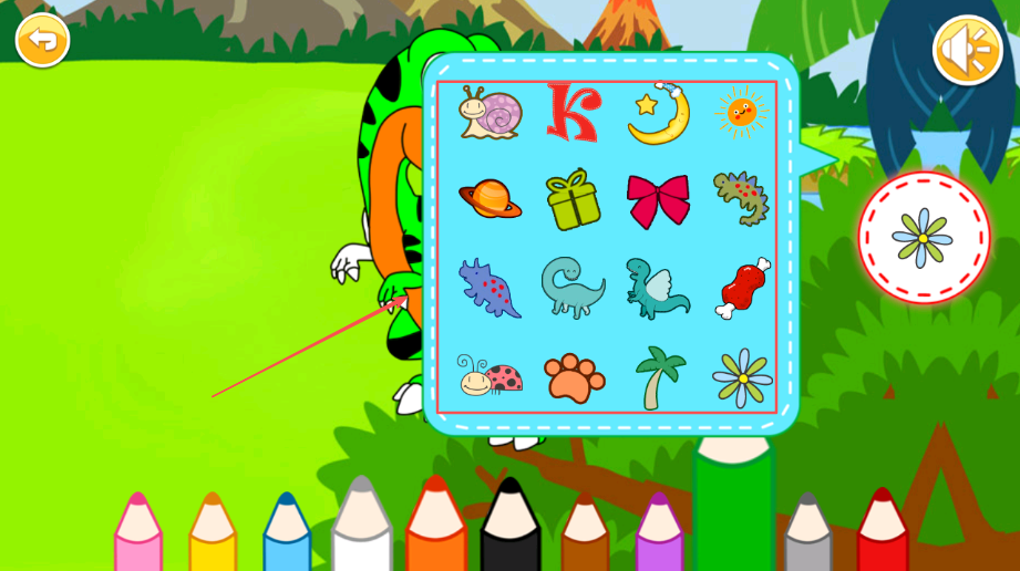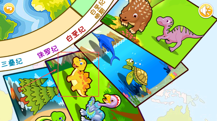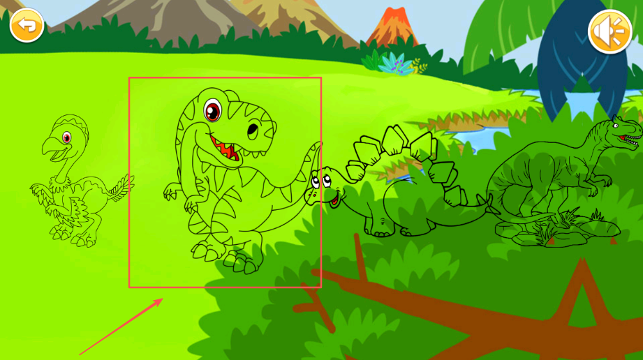 1、首先需要进入游戏主界面选择感兴趣的恐龙图案开始涂色创作体验,通过观察不同恐龙的名称标注和特征介绍来了解相关科普知识内容。