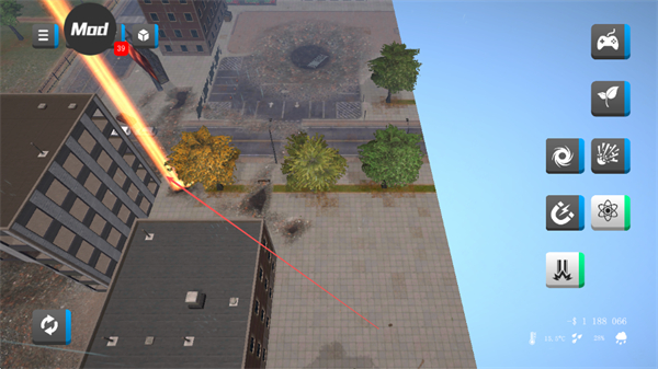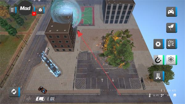 1、选择右侧的特殊工具如磁铁、激光等,对城市建筑、植被区域释放,制造破坏效果。