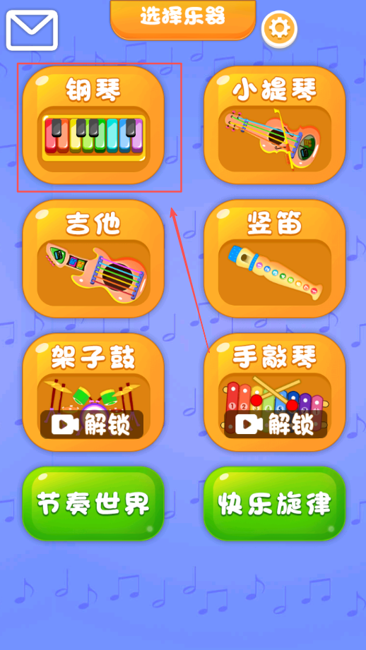 1、首先需要进入游戏主界面选择感兴趣的乐器开始学习体验,通过互动认识乐器名称和发声特点以及基本演奏方法和使用技巧。