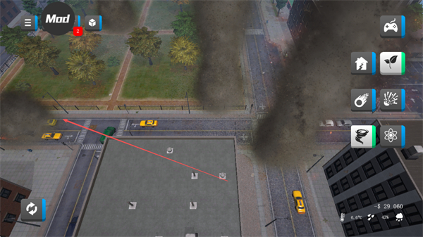 1、选择右侧的灾害工具如龙卷风、核爆等,对城市区域如公园、街道释放灾害。