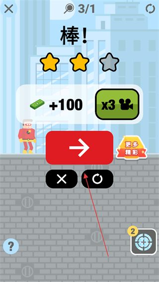 4、关卡完成后获得+100金币奖励,可点击红色箭头进入下一关或观看视频获得3倍奖励。