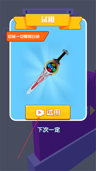 1、在道具界面,可试用强力工具如彩色剑,通过观看视频解锁试用,提升切割效率。