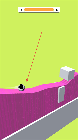 2、操控切片工具切割粉色障碍物,降低其高度,推进关卡进度,注意躲避白色方块等障碍物。