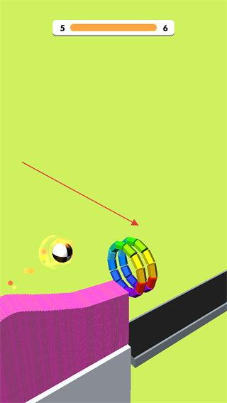 3、切割后操控黑白球在粉色障碍物上移动,找准路径,向彩色火焰圆环前进。