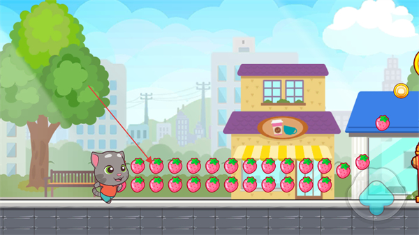 1、操控汤姆猫在城市街道中奔跑,收集沿途的草莓、糖果等道具,积累得分。
