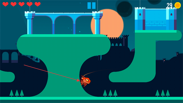 3、在蜿蜒地形中穿梭,收集沿途金币,保持血量左上角红心,避免碰撞障碍物。