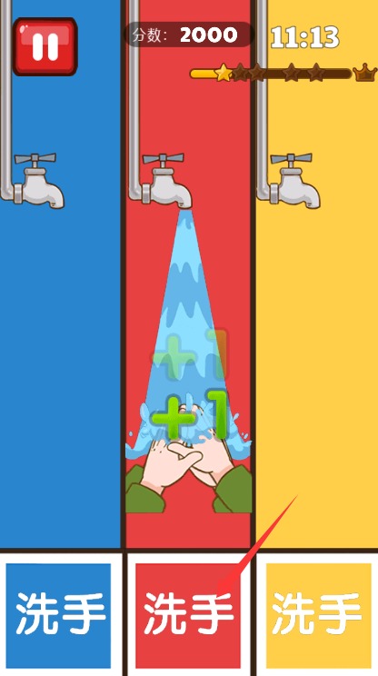 哪个水龙头出水,就在哪个下面洗手,只有一个要求:就是看准了狂点。入门级关卡,非常容易拿五星。