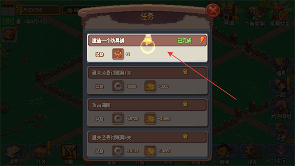 2、完成主线任务如建造一个防具铺,获取任务奖励,提升游戏进度。