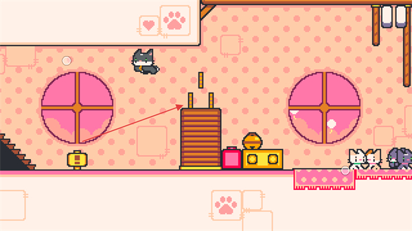 1、操控小猫移动,收集橙色铃铛道具,按照箭头提示推进关卡,注意场景中的互动元素。