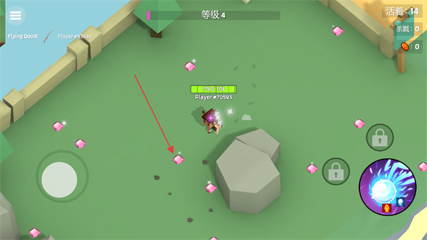 3、在竞技场景中躲避攻击,收集粉色宝石,争取存活到最后。