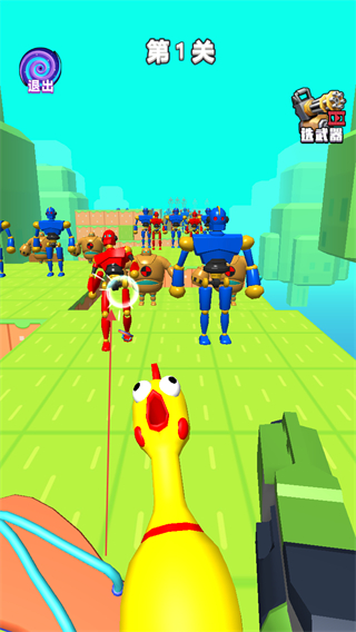 1、进入第1关,面对机器人集群,操控武器瞄准红色机器人,准备射击。