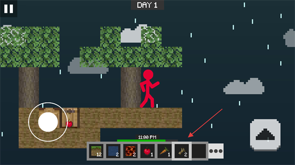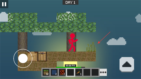 采用经典2D像素风格设计,画面简洁却富有细节,火柴人角色形象鲜明,空岛场景色彩搭配协调,营造出独特的沙盒生存视觉氛围。