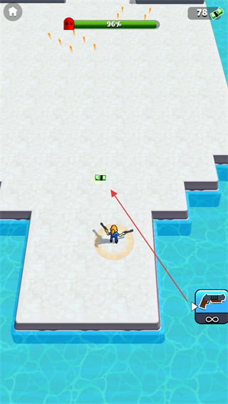 2、在移动和射击过程中,注意收集绿色钞票,积累资源,同时避开水域等危险区域。