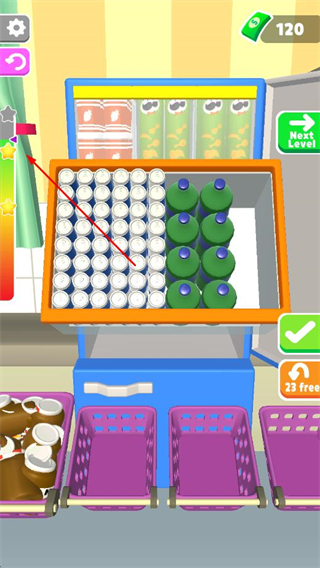 2、摆放物品时,要注意物品的形状和大小,尽量填满冰箱空间,左侧为此时关卡的星星颗数。