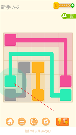 1、观察网格中相同颜色的方块,点击其中一个方块,然后找到与其颜色相同的另一个方块,绘制连线将它们连接起来。