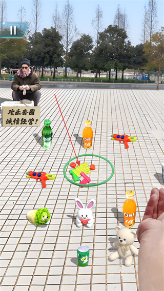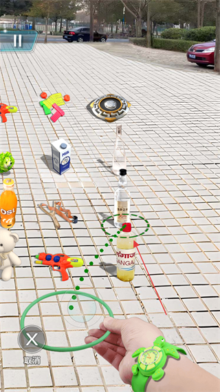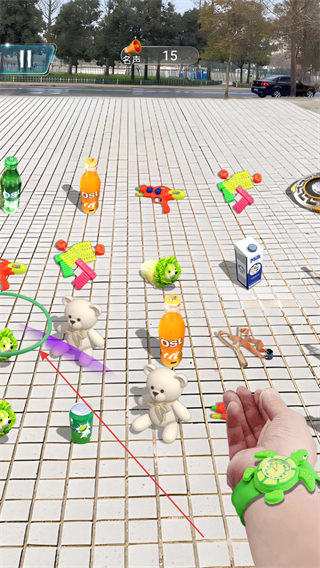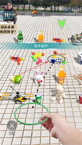1、观察场景中各类物品的位置,瞄准目标如玩具、饮料等,调整投环的角度和力度。