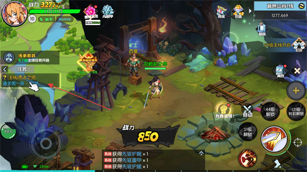1、跟随任务指引,在场景中自动寻路,完成主线任务,如击败山谷领主、与NPC对话等。