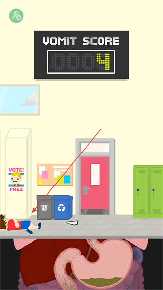 1、操控角色移动,在场景中收集呕吐物,提升呕吐分数。
